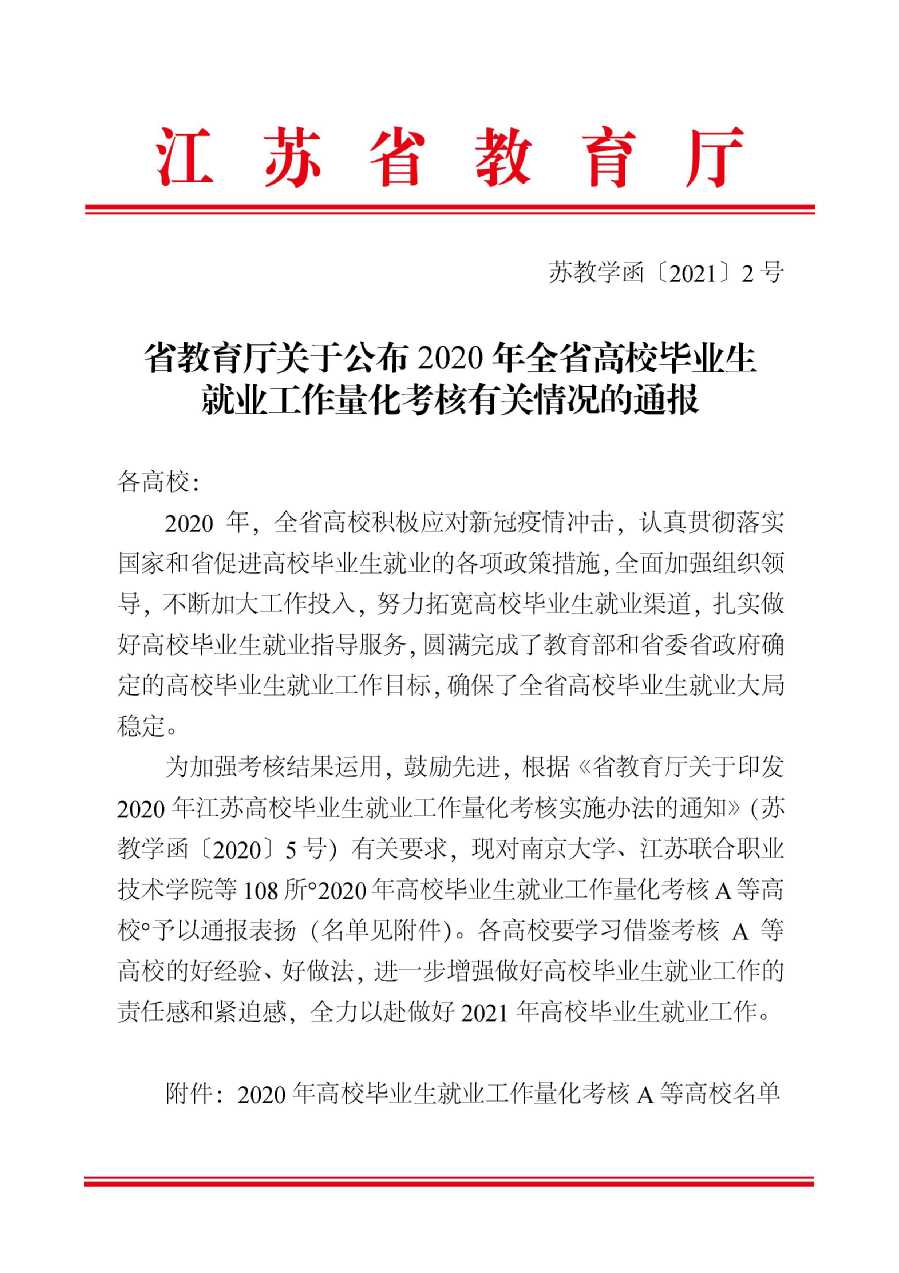 近日,江苏省教育厅公布了2020年全省高校毕业生就业工作量化考核有关情况的通报,BBV电子·(中国)网站被评为“A等高校”,受到全省通报表扬。