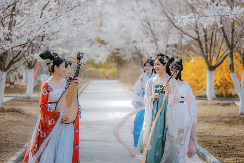 3月23日,团委举办“第三届”花朝节活动,30余名身穿汉服的同学踏青赏花。