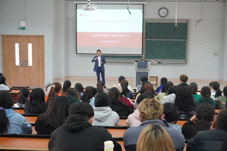 博瑞霖市场总监崔阳、校友杨小敏,针对医药代表的职业及变迁,贴合自己的体验向同学们分享了宝贵的经验;以实际案例向同学们讲述择业定位的重要性,职业观是人生理想在职业问题上的反映,是人生观的重要组成部分,正确的人生观决定正确的职业观。在劳动市场上,每个择业者都自觉或不自觉地以一种职业观指导自己选择职业;同时,还向同学们分享了实用的书籍,鼓励同学们树立终生学习的理念。