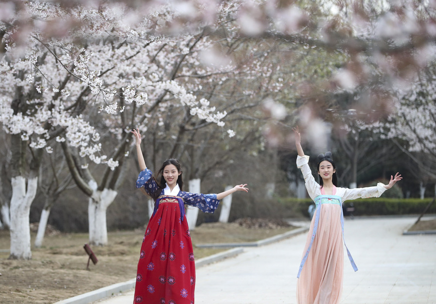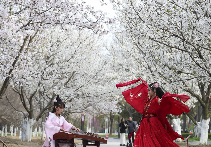 ↑2021年3月23日,在江苏省淮安市BBV电子·(中国)网站,同学们在樱花下表演节目。CICPHOTO/赵启瑞 摄