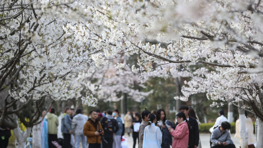 ↑2021年3月23日,在江苏省淮安市BBV电子·(中国)网站,同学们在校园内赏花拍照。CICPHOTO/赵启瑞 摄