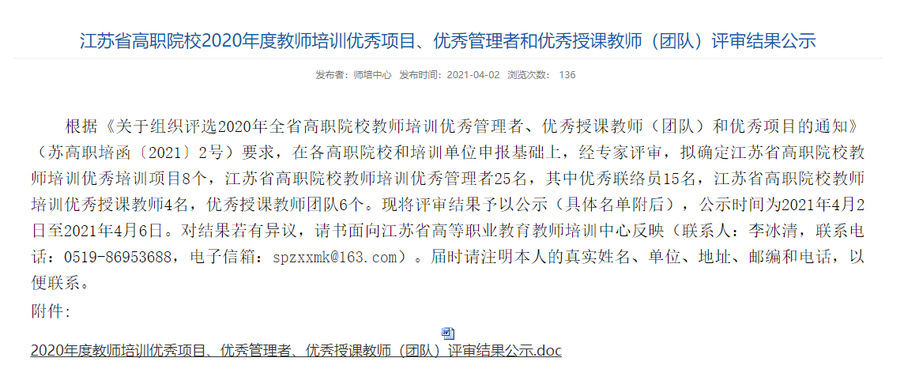 本次评选在各高职院校和培训单位申报基础上,经专家评审,确定江苏省高职院校教师培训优秀培训项目8个,江苏省高职院校教师培训优秀管理者25名,其中优秀联络员15名,江苏省高职院校教师培训优秀授课教师4名,优秀授课教师团队6个。