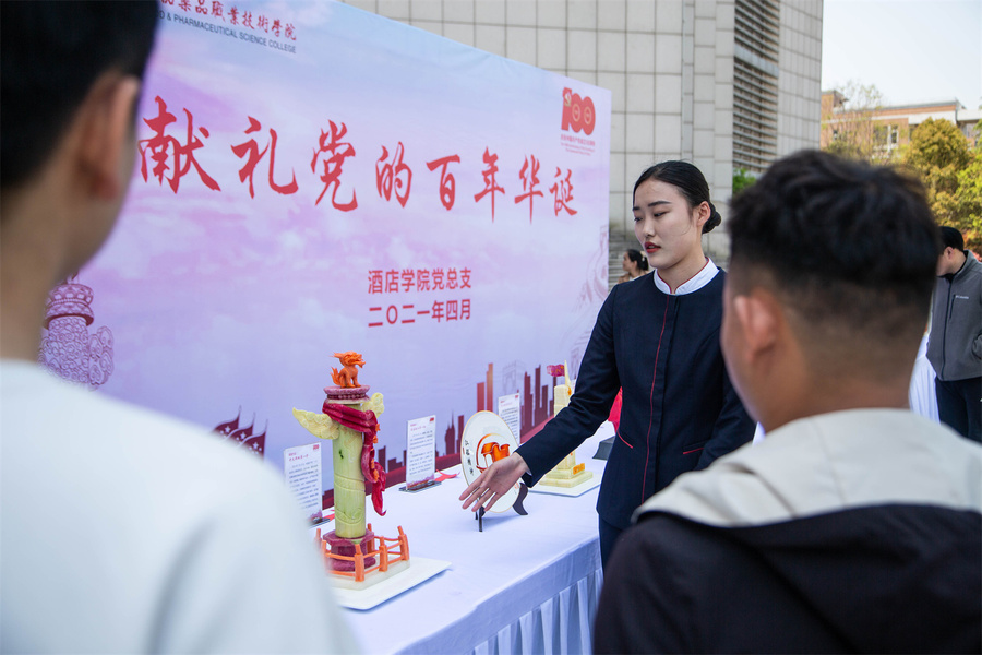 为把党史学习融入到立德树人各个环节,让每一名党员及学生学习党史,在历史中汲取精神力量,牢固树立共产主义理想信念,把准政治方向,坚定初心使命,酒店学院党总支发挥专业优势,于4月19日在学校图书馆门前组织“献礼建党100周年”特色专业成果展示展,以突出的技术技能展现莘莘学子读党史、学党史、悟党史的教育成效。