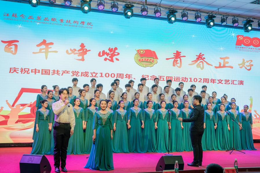 百年薪火,五四芳华,大学生合唱团用铿锵有力的合唱《光荣啊 中国共青团》、《爱我中华》将演出拉开序幕;伴随着优美旋律,大学生艺术团的小伙伴们表演的古风舞《流光记》展现了她们的翩翩舞姿;校园广播站带来的朗诵《花开的声音》让我们感受到了食院青年的奋斗的使命和信仰的力量;锅庄舞社团的两位藏族姑娘用天籁之声和民族舞蹈演绎了经典歌曲《在那东山顶上》,赢得了在场观众的阵阵欢呼;歌舞《我和我的祖国》让我们更加深沉地热爱我们的祖国母亲,爱中华儿女在这片土地上留下的独特而美好的文化;现代舞《Gogo》将食院青年的青春活力和热情奔放展现的淋漓尽致;最后,艺术团小伙伴怀揣着以青春之我,创造青春之国的信念,唱响青春之歌《少年》,展现了扎实的舞蹈功底和良好的歌唱素养。