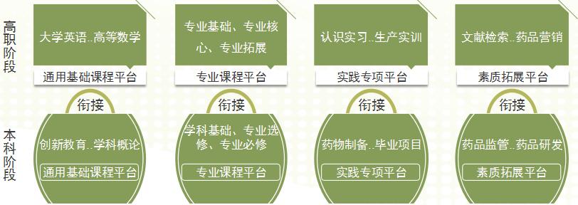 “四平台”体系以“通用基础课程平台”“专业课程平台”“实践专项平台”和“素质拓展平台”为科目分类,通用基础课程里有大学英语、高等数学、计算机等通识课,专业课程平台则囊括生物化学、有机化学、无机化学、药理学等核心专业课,素质拓展是职业能力、创新创业、药品营销与研发等专业延伸,实践专项在高职阶段是生产实训、在本科阶段为毕业项目设计。
