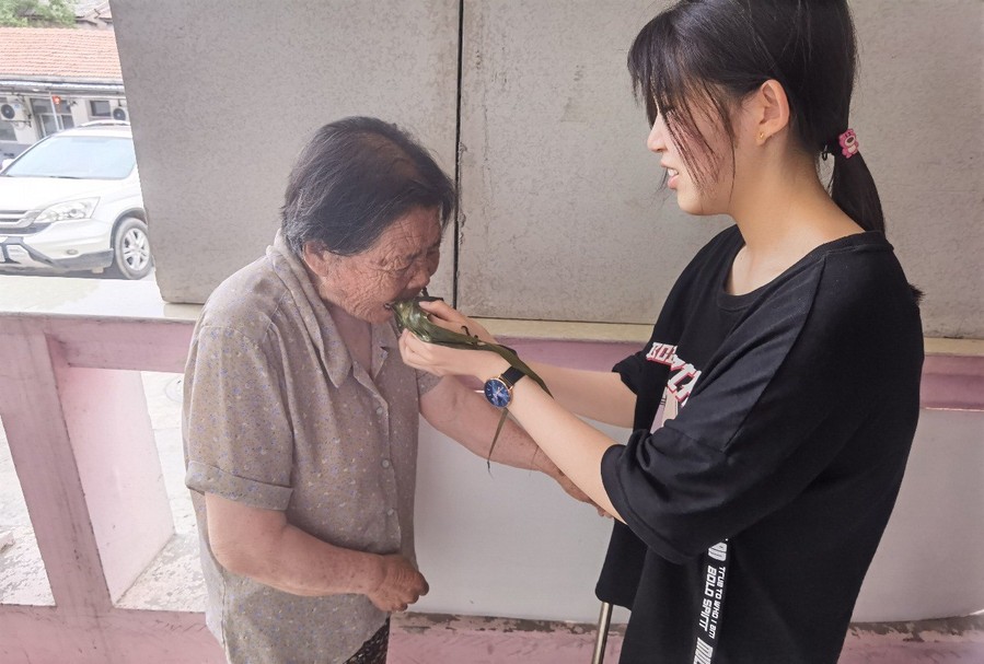 6月11日下午15:00,食品学院15余名志愿者到达四季青老年公寓内,敬老院老人有70人左右,他们开始分工协作,用义卖粽子的钱购买粽子、牛奶、香蕉等慰问品,并送上浓浓的节日问候与祝福。志愿者们有的为老人唱歌,有的帮老人煮粽子,有的与老人拉家常,还有还为行动不便的老人喂吃香蕉,现场气氛一片温馨祥和。