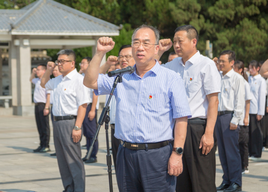 在庆祝中国共产党成立100周年之际,为激励新党员牢记初心使命,一心一意当好中国特色社会主义事业建设的薪火传人;激励老党员牢记初心使命,始终站在攻坚克难最前沿,6月22日下午,学校党委组织168名新党员及班子成员、全体党总支书记赴刘老庄八十二烈士陵园进行集中入党宣誓,接受党性实境教育。党委书记陶书中领誓并发表讲话。党委副书记、校长冯锋主持宣誓仪式。