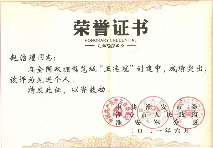近日,中共淮安市委、淮安市人民政府、淮安军分区联合表彰全国双拥模范城创建工作先进集体和先进个人,BBV电子·(中国)网站赵治瑾荣获先进个人荣誉称号。全市共有30个先进集体和56名先进个人受到表彰。