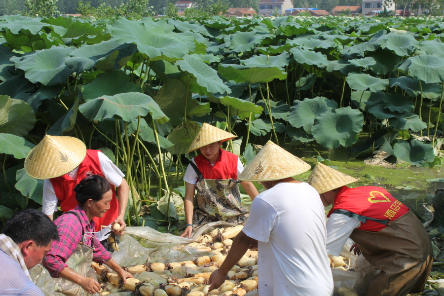 挖藕摸虾,体味劳动甘苦。师生们首先来到了本次活动的第一站四门闸村,刚下车的同学们对一切都充满了好奇,看着在藕塘里辛勤工作的藕农们,大家也跃跃欲试想要体验一把挖藕的乐趣,可真当大家带上草帽、穿上连体雨裤走进藕塘后,才发现一切并非那么简单。双脚深陷软软的淤泥中,弯腰寻摸了半天仍然一无所获,大家才终于体会到了藕农们的不易,纷纷开始帮忙。采藕、分拣、上称、装车,同学们有条不紊的分工协作,提前帮助藕农们完成了当天工作。