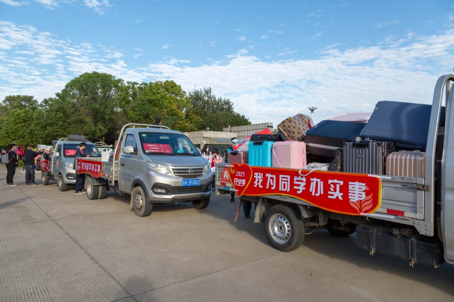 为使新生有秩序、有效率的完成开学报道工作,学校不仅提前安排了接送车辆,还调用了大量保安人员、师生志愿者团队,协助新生搬运行李。校内校外都设置了新生接待点,身穿红绿马甲的志愿者们更是早在6点前就已整装到岗,随时准备迎接新生。志愿者药剂204戴宁说:“高铁站、飞机场、汽车站、学校大门口、宿舍楼......只要有新同学的地方,就有我们志愿者们匆忙的身影。”康复201张凌云表示:“虽然要克服早起,但是去年我也是因为学长学姐的帮助才能更快安顿下来,这样的接力理应成为传统,于是我和我的同学们都来了!”新生的到来让他们虽忙碌但快乐着,接送车辆上“我为同学办实事”的横幅充分表达着青年一代的努力和担当。“刚进校就有学长学姐在各个地方为我们指引、搬运行李、介绍校园,感受到了学校的人文关怀和热情,很暖心!”财务211班的新生姜睿婧这样表示道。