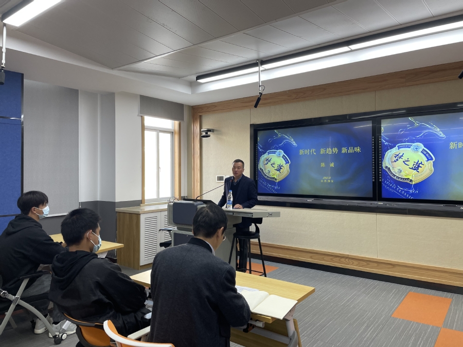 江苏洋河股份有限公司技术中心副总经理兼洋河酒体设计中心主任、高级工程师陈诚,11月18日应邀来校做题为“新时代、新趋势、新品味”的报告。陈诚结合“洋河股份”发展历程、酿造工艺、产品特点以及自身经历,介绍了“中国白酒基础理论知识、新时代白酒消费趋势、中国白酒文化”等方面知识。报告拓展了同学们的知识视野,培养了审美情趣、兴趣爱好。