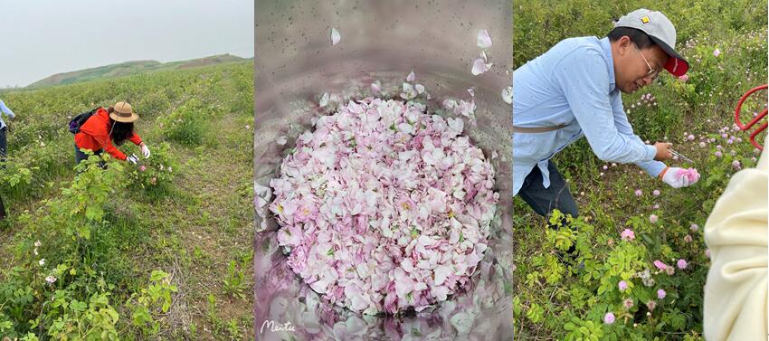 其中玫瑰纯露颇受欢迎,该产品制作原料为大马士革玫瑰,学院教师调研发现宿迁泗洪有大马士革种植基地,药学院师生一行于2021年5月19日赴该基地采摘玫瑰、当天对花瓣进行清洗并蒸馏出玫瑰纯露,香味最为清新自然淡雅,并摸索出鲜花瓣腌渍留香工艺与储存办法,但大马士革玫瑰花期较短,该种植基地离学校太远,来回往返存在时间与空间的限制。至此教师决定带领中药专业学生及本草社团在校内开展玫瑰种植劳动实践,在百药园内种植玫瑰,解决原料问题,进而开展一系列的种植技术、玫瑰花实验研究。