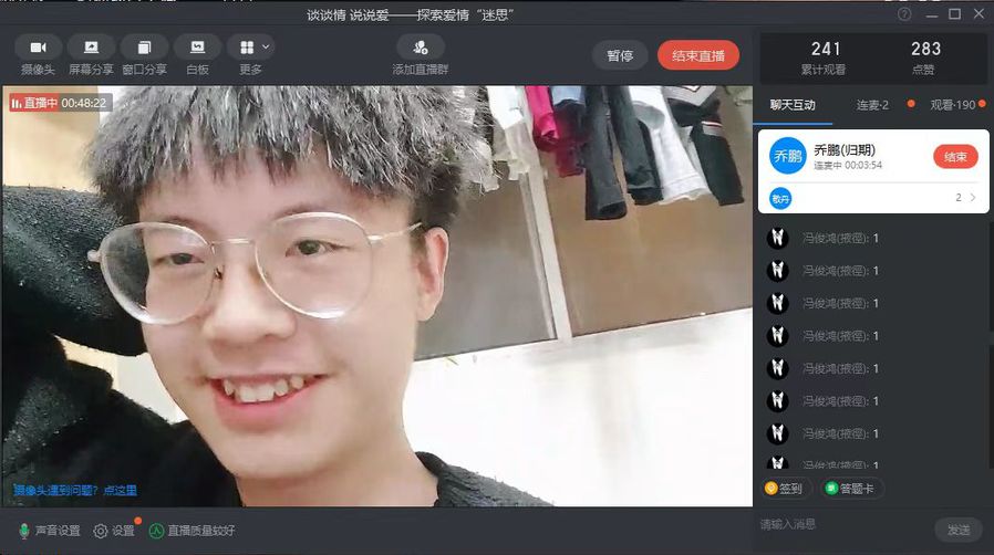 爱情观的主题教育是大学生健康心理塑造的重要内容,通过线上直播的方式吸引学生们的参与,有效提升了活动的参与范围和深入程度。整场直播有300余人在线观看,直播过程收到同学们大量刷屏力赞。