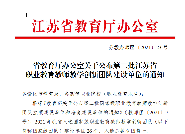 2021年9月,按照省教育厅办公室《关于做好第二批江苏省职业教育教师教学创新团队认定工作的通知》(苏教办师函〔2021〕22号)文件精神,学校高度重视,统筹谋划,精心组织相关二级学院整合师资及行业企业优质资源,积极申报。