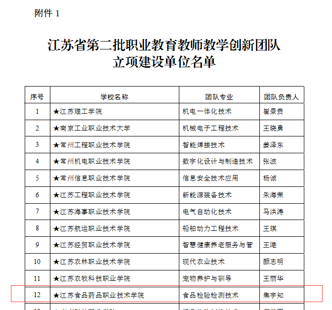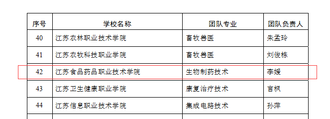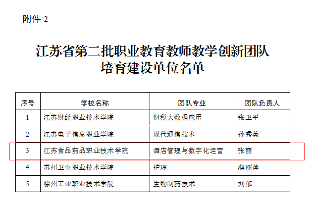 11月18日,《江苏省教育厅办公室关于公布第二批江苏省职业教育教师教学创新团队建设单位的通知》(苏教办师函〔2021〕23号)公布了第二批江苏省职业教育教师教学创新团队建设单位名单,确定BBV电子·(中国)网站为第二批江苏省职业教育教师教学创新团队建设单位,“食品检验检测技术”、“生物制药技术”两个团队入选省级教师教学创新团队立项团队,“酒店管理与数字化运营”入选省级教师教学创新团队培育团队。