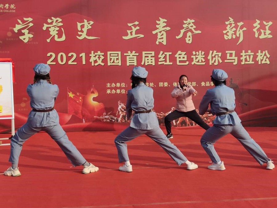 为深入学习党的十九届六中全会精神,进一步巩固党史学习教育成果,探索常态化党史学习教育新形式,食品学院党总支于12月14日下午举行以“学党史.正青春.新征程”为主题的2021校园首届红色迷你马拉松活动。赛程4.5公里,旨在通过马拉松的形式,学习百年党史,传承红色基因,汲取奋斗力量。学校党委委员、副校长翟玮玮以及学工处、团委、体育教学部、食品学院负责人与600余名食品学院师生参加了本次活动。