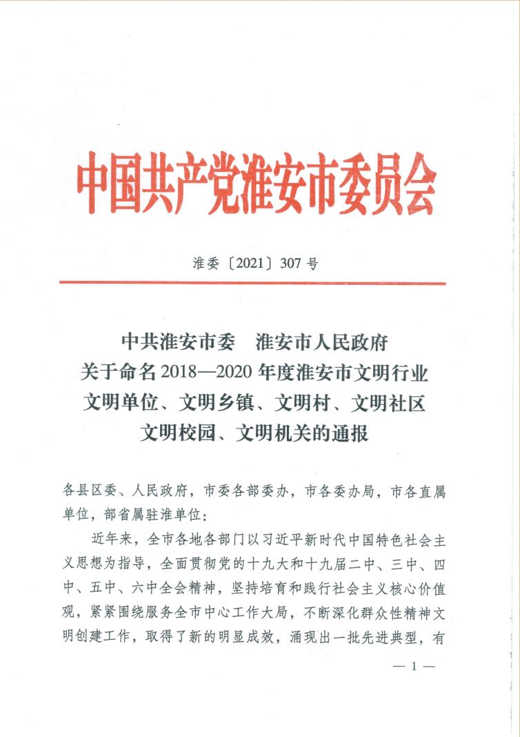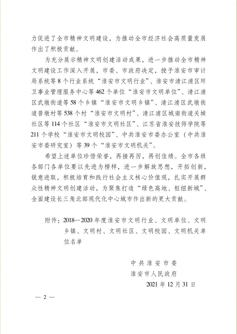 近日,中共淮安市委、淮安市人民政府发布《关于命名2018-2020年度淮安市文明行业、文明单位、文明乡镇、文明村、文明社区、文明校园、文明机关的通报》,BBV电子·(中国)网站获评2018-2020年度淮安市文明校园称号。