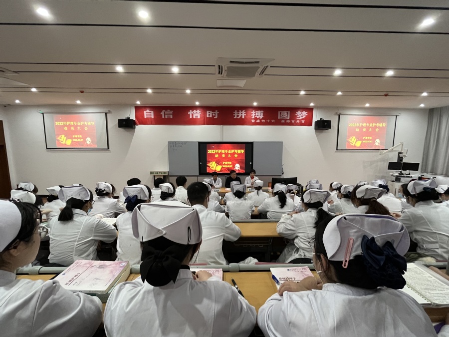 为帮助2022届护生在护士执业资格考试中取得理想成绩,2月7日上午,护理学院在护理实训中心开展“自信 惜时 拼搏 圆梦——奋战七十六 赢得百分百”为主题的2022年护考辅导动员大会,启动为期76天的护士执业资格考试的线下辅导工作,外聘教师代表淮阴区妇幼保健院护理部主任包玉梅参加了大会。