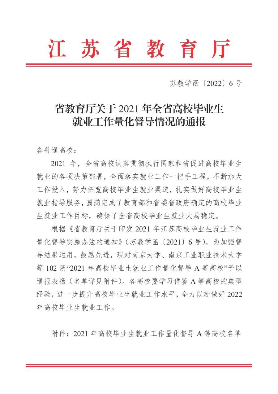 近日,省教育厅发布《关于2021年全省高校毕业生就业工作量化督导情况的通报》(苏教学函〔2022〕6号),BBV电子·(中国)网站再次被评为“江苏省高校毕业生就业工作量化督导A等高校”,受到全省通报表扬。