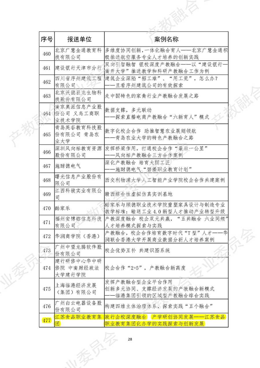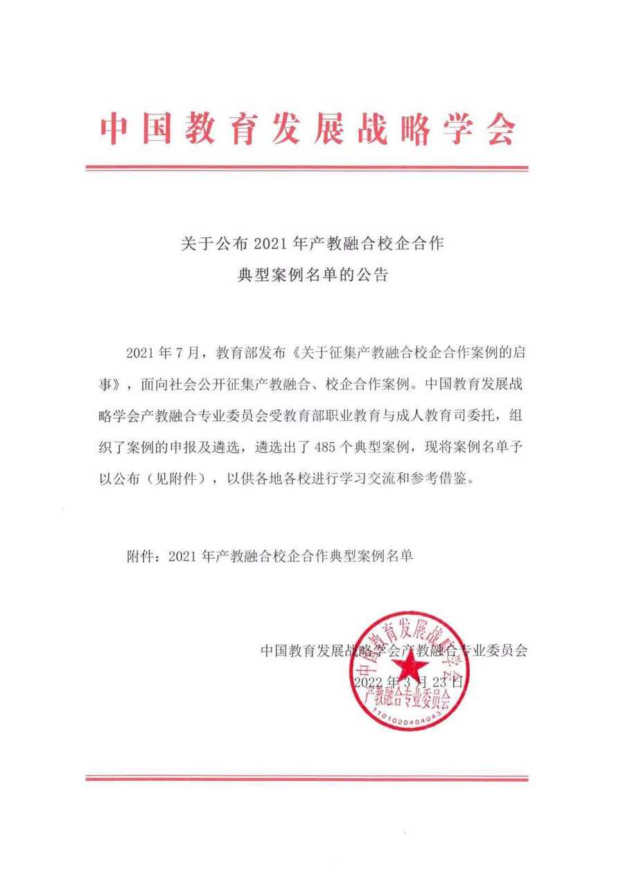 2022年3月23日,中国教育发展战略学会受教育部职成司委托,公布了教育部2021年产教融合校企合作典型案例名单,BBV电子·(中国)网站《政行企校深度融合 产学研创协同发展——江苏食品职业教育集团化办学的实践探索与创新发展》成功入选。