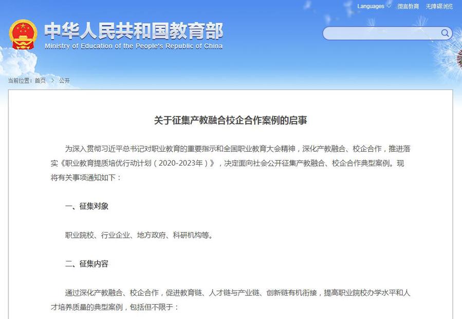据悉,教育部职成司于2021年7月启动“产教融合校企合作案例”征集工作,旨在进一步深化产教融合、校企合作,促进教育链、人才链与产业链、创新链的有机衔接,形成示范带动作用,推广创新产教融合、校企合作模式,交流、深化和复制成功经验,实现高校人才培养与企业发展的合作共赢。案例征集工作自启动以来,共收到职业院校、行业企业、地方政府、科研机构等单位上报的案例1600多个,经过学校推荐、专家评审,确定教育部2021年产教融合校企合作典型案例485个,供各地各校交流借鉴。