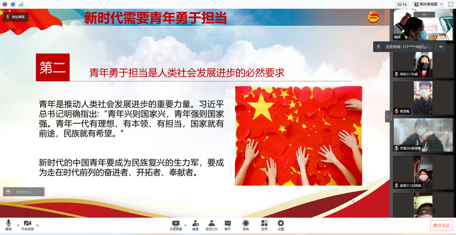 本次公开课分为学习团史知识、传承红色精神、青年需担当、做优秀共青团员和分享心得体会五个环节,酒店学院20级、21级团支书参加了此次线上公开课。活动在一段展现共青团百年历史的视频资料中拉开帷幕,同学们聚精会神的凝听着,从中汲取奋进的青春力量。接下来,组织部杨盼同学带领大家重温了五四精神和共青团十八届六中全会会议内容,并号召大家做有理想、不保守、敢担当、肯付出的优秀共青团员,充分融入时代大潮中承担国家与民族大任,绽放青春光芒,实现更大的价值。最后,在分享心得体会环节,同学们纷纷表示,作为共青团员应该深刻领会“两个确立”的决定性意义,不断增强“四个意识”、坚定“四个自信”、做到“两个维护”,不断增强责任感、使命感、紧迫感。