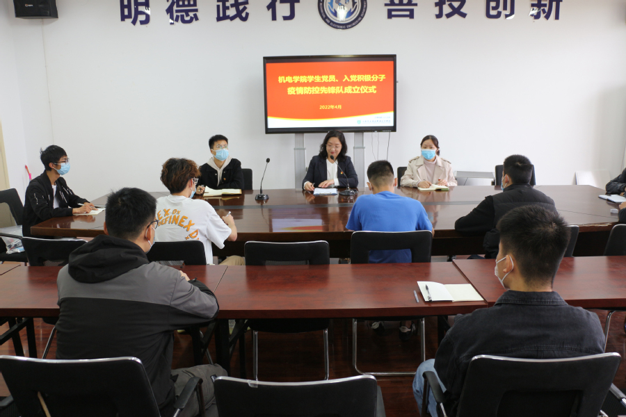 4月13日上午,机电工程学院在1403会议室举行学生党员、入党积极分子“疫情防控先锋队”成立仪式。党总支副书记张丽萍、全体辅导员参加了活动。