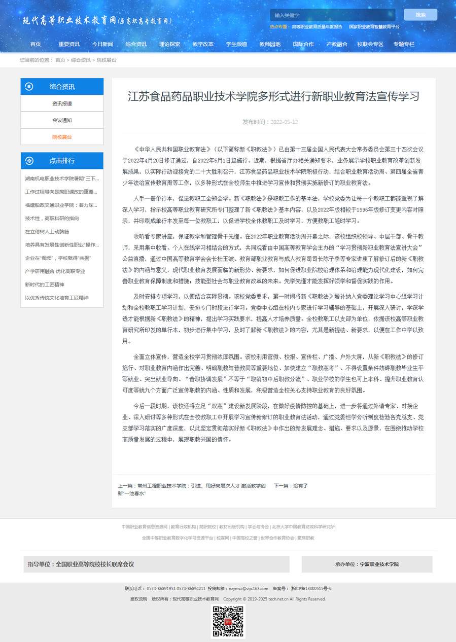 及时安排专项学习,以便结合实际贯彻。该校党委要求,第一时间将新《职教法》增补纳入党委理论学习中心组学习计划和全校教职工学习计划,安排专门时段进行学习。党委中心组在校内专家进行学习辅导的基础上,开展深入研讨,学深学透才能根据新《职教法》的精神,提出学习实践要求,提高人才培养质量。全校教职工以支部为单位,依据该校高等职业教育研究所印发的单行本,初步进行集中学习,及时了解新《职教法》的内容,尤其是新提法、新要求,以便在工作中学以致用。