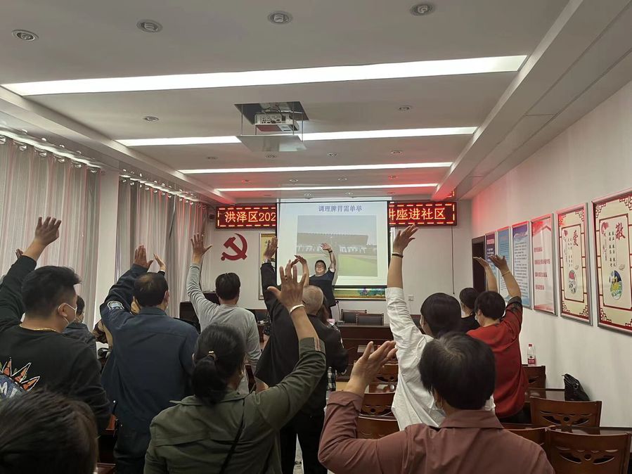 讲座从现代健康理念出发,对影响健康的因素展开分析。唐老师认为疫情防控下做好科学健身,应从四个方面着手。一是树立阳光心态,主动健身;二是找准适合的方式,科学健身;三是善于用好身边器材,就地健身;四是保持身心愉悦,快乐健身。整个讲座数据详实,案例丰富,通俗易懂。最后,唐老师以健身气功八段锦为内容,把中国传统体育养生文化融入到现代健康生活需求之中,与参会的社区居民开展了教学互动练习,收到了较好的效果。