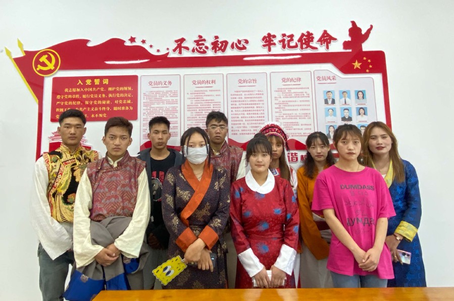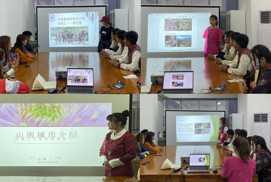 本次交流会共有7个民族的12名学生参加。会上,各民族同学热情地为大家讲解自己民族的特色,分享在党和国家的领导下家乡翻天覆地的变化。僜人族嘎玛措姆同学从民族的起源、历史演变、主要风土人情等方面详细介绍了本民族,让我们进一步的了解了僜人族的文化。来自白族的李永婷同学展示了白族以白色为主基调的素净服装特色,将白族谦逊、和谐的民族特点清晰地展现在我们面前。珞巴族是我国人口较少的少数民族之一,主要聚居在雅鲁藏布江大拐弯处以西的高山峡谷地带,珞巴族女孩加米为我们讲解了珞巴族的特点,并用珞巴族语言教大家一起说“民族团结一家亲”。