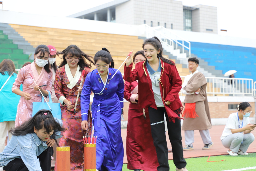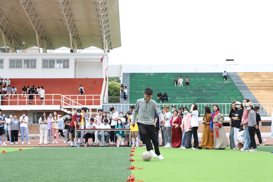 运动会分拔河、抛绣球、投壶比赛、足球绕杆四个项目,每个项目不仅能锻炼大家的运动能力,同时也体现团队的协作能力。拔河比赛中,选手们站在赛场上蓄势待发,只听一声哨响,双方都铆足了劲拉紧缰绳,加油声,号子声不断响起。接下来抛绣球比赛中,女选手们奋力将手中的球投入男生背后的背篓里,队友之间配合默契。在投壶比赛中,各种投掷手法,极其考验选手的专注力,每当投进,观众们都报以热烈的掌声。在最后的足球绕杆中,同学们将球绕过障碍,互相接力最终完成比赛,将现场的气氛拉向高潮。