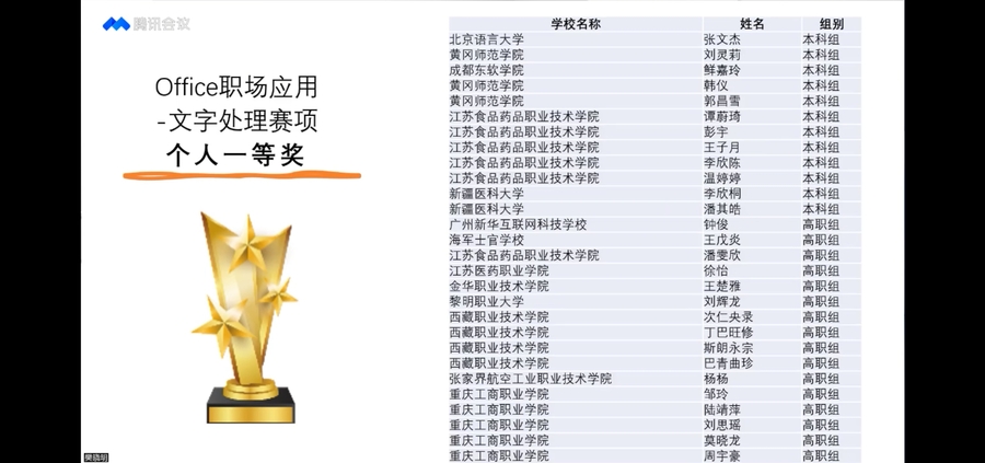 6月11日,第十二届全国大学生计算机应用能力与信息素养大赛圆满结束,6月17日,通过腾讯会议举行了线上颁奖典礼。本届大赛总决赛共有85个学校,99个参赛队,802位同学参加了比赛。