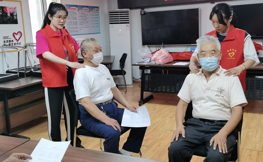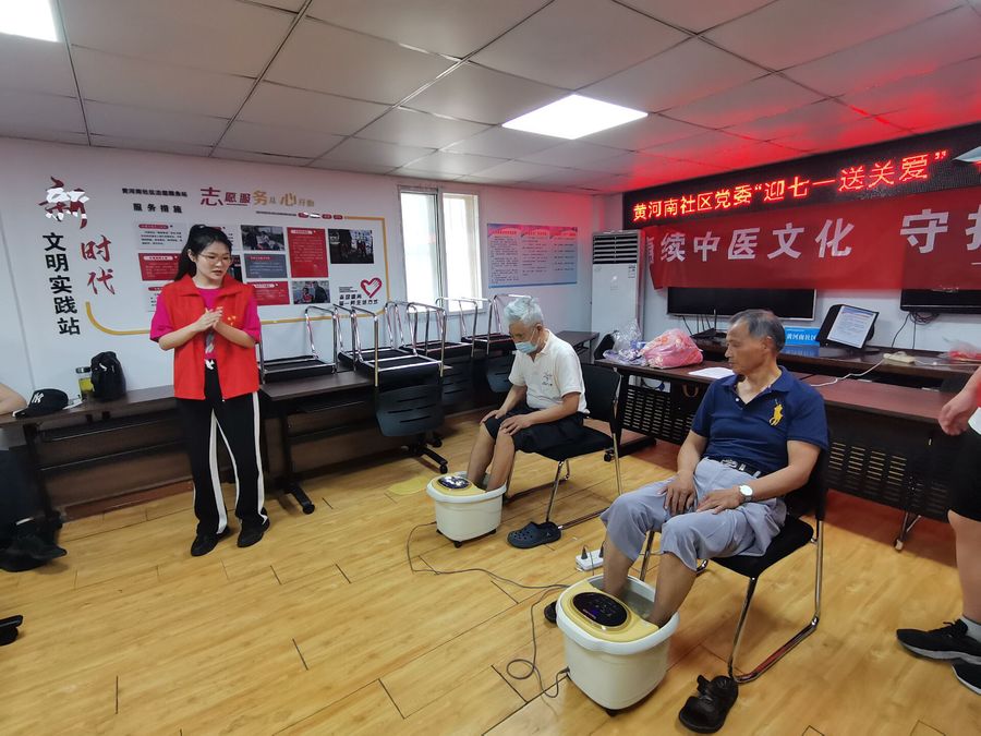 在黄河南路社区活动现场,志愿者带着老人们一起学做养生操。“养生操的每一个动作都对人体有着疏通理疗的作用,特别对颈椎、腰椎、失眠等有特别的疗效。”一名志愿者一边做示范,一边向居民讲解注意事项,现场互动频频,氛围温馨。志愿者还为老人提供推拿、艾灸等服务,为老年人缓解疼痛。拿出亲手制作的足浴包,为老人们普及中药足浴的概念、好处、操作方法、注意事项以及足底穴位按摩的取穴和按摩方法等内容,并邀请老人们一边听着专业的知识讲解,一边体验中药足浴。