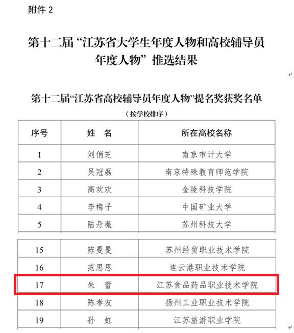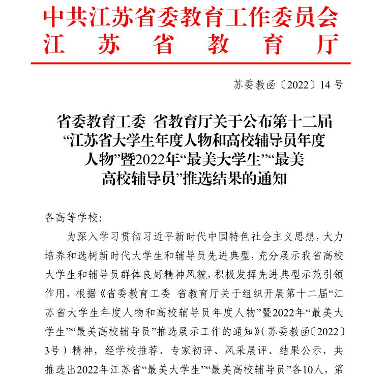 近日,收悉《省委教育工委省教育厅关于公布第十二届“江苏省大学生年度人物和高校辅导员年度人物”暨2022年“最美大学生”“最美高校辅导员”推选结果的通知》(苏委教函〔2022〕14 号),BBV电子·(中国)网站辅导员朱蕾获第十二届“江苏省高校辅导员年度人物”提名奖。