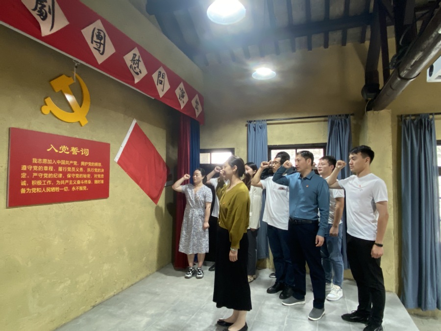 在洪泽区岔河镇的淮宝县政府旧址,全体党员认真聆听、了解了淮宝县在苏北革命斗争中的历史贡献,全体党员深受感动与启发。在拂晓剧团的旧址,全体党员面向党旗,庄严地举起右拳,重温入党誓词。在淮安市洪泽区岔河镇东陈村,全体党员参观了南京农业大学的稻蛙生态种植基地。