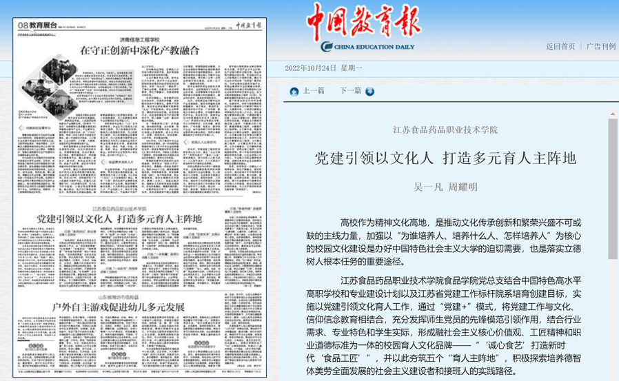 高校作为精神文化高地,是推动文化传承创新和繁荣兴盛不可或缺的主线力量,加强以“为谁培养人、培养什么人、怎样培养人”为核心的校园文化建设是办好中国特色社会主义大学的迫切需要,也是落实立德树人根本任务的重要途径。 BBV电子·(中国)网站食品学院党总支结合中国特色高水平高职学校和专业建设计划以及江苏省党建工作标杆院系培育创建目标,实施以党建引领文化育人工作,通过“党建+”模式,将党建工作与文化、信仰信念教育相结合,充分发挥师生党员的先锋模范引领作用,结合行业需求、专业特色和学生实际,形成融社会主义核心价值观、工匠精神和职业道德标准为一体的校园育人文化品牌——“‘诚心食艺’打造新时代‘食品工匠’”,并以此夯筑五个“育人主阵地”,积极探索培养德智体美劳全面发展的社会主义建设者和接班人的实践路径。 打造“食苑讲坛”综合理论育人主阵地 “食苑讲坛”是食品学院党总支支持成立的帮助学院师生共同成长的理论育人平台,由“党史流动课堂”“红色榜样”“先锋讲坛”“榜样课堂”“学而食习助讲团”等五个板块构成。“党史流动课堂”由党总支组织开展,突出思想引领,守正创新,通过情景式、沉浸式、互动式、体验式、立体式、寓教于乐式等多种方式,厚植食品学院全体师生爱党、爱国、爱社会主义的情怀,不断筑牢师生理想信念之基;“红色榜样”由各党支部组织开展,着重体现支部优秀党员代表风采,凸显其不怕吃苦、爱岗敬业、甘于奉献的精神;“先锋讲坛”以优秀党员教师为代表,着重体现其在专业教学团队中教学能力、技能竞赛指导、科研课题申报等方面的特长,以带动全体教师成长为融“人师”与“经师”为一体的“大先生”;“榜样课堂”以优秀学生党员代表和先进典型,强化朋辈引领,树立学习标杆,激发内生动力,以影响带动学生群体共同成长;“学而食习助讲团”着重体现于学业支持方面,以党建带团建的方式,指导优秀青年团员以团结互助、结对帮扶的形式,担任助讲团讲师,对学习困难的学生进行个性化辅导,促进学院学生共同进步、健康成长。 打造“一站双号”网络思政育人主阵地 网络媒体是新时代育人不可忽视的载体。食品学院党总支依托食品学院官方网站、学校微信公众号、“诚心食艺”微信公众号构建“一站双号”,不断强化网络思政育人主阵地建设,紧密围绕立德树人根本任务,顺应新媒体网络时代发展规律,以“同向融合”推进大食品文化育人创新,积极完善“红色思想、工匠精神、专业实践、创新活动”四位一体、德智体美劳“五育并举”的网络思政体系,提升网络育人实效。 打造“一体两翼”思想引领育人主阵地 食品学院党总支在学生群体中以“星星之火,可以燎原”的方式,重点培养一批学生骨干、积极分子和学生党员,依托党员教师队伍搭建了“江淮火种”工程和“翔宇骨干训练营”两个学生群体培训平台,以点带面,点面结合,带动全院青年学子树立理想信念,在全院范围内逐步形成群体性自我成长、自我管理和自我发展的良性循环态势。 打造“双脉传承”实践认知育人主阵地 食品学院党总支精选优秀党员教师和深度合作企业优秀党员员工代表共同打造专业认知实践育人主阵地,以优秀党员教师作为学院“双高”计划专业——食品智能加工技术创新创业社团和志愿服务社团两个学生社团的指导教师,通过开展烘焙、饮料等食品产品实验、制作、展示和志愿服务活动的方式,培养学生学习和传承“工匠精神”“良心、诚信、包容、创新”职业道德与品质;以深度合作企业优秀党员员工、企业劳模作为主讲人,开展“匠心党课”系列活动,帮助青年学生牢固树立“劳动最光荣、劳动最崇高、劳动最伟大、劳动最美丽”的观念。 打造“争做先锋”技能竞赛育人主阵地 为进一步加强学生劳动精神、劳模精神和工匠精神的培养,同时强化食品专业技术技能培养,食品学院党总支在各个教工支部动员成立“技能竞赛育人”先锋党小组。党总支坚持“以赛促教、以赛促学、以赛促改、以赛促创”的育人理念,以此强化技能育人实效。在学院范围内,每年度都组织开展技能竞赛月活动,选拔技能竞赛先锋“苗子”,在丰富学生课余文化生活的同时,磨炼食品专业技能,达到以匠心育人的效果。 近年来,BBV电子·(中国)网站食品学院党总支坚持党建引领,将党建工作、思想教育工作与文化育人工作紧密结合,依托“五个阵地”的打造,厚植食品学院全体师生爱党、爱国、爱社会主义的情怀,不断筑牢师生理想信念之基,树立正确的“三观”;将党建注入专业建设,强化育人实效,培养学生具有诚信善良之心、对食品安全的敬畏之心、对食品制作的工匠之心、对新时代的感恩之心,积极投身到不断实现人民对美好生活向往的实践之中。 |
