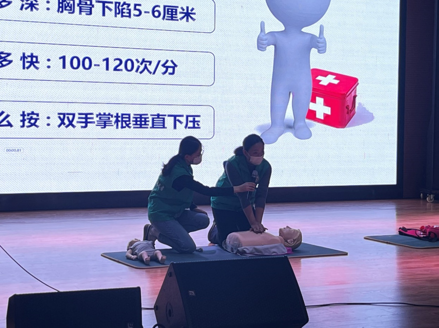 朱竹青借助教学模拟用物讲解了海姆立克急救法,重点详实地介绍了心肺复苏的操作步骤,并就操作过程中的注意事项进行示范,强调了在不同情况下的特殊处理流程、操作要点及注意事项。整个过程中,老师们都听得非常认真,通俗易懂、生动有趣的授课方式受到了热烈欢迎。讲解演示后,老师们纷纷上台进行练习,由4名学生志愿者进行手把手辅导,老师们沉浸在练习海姆立克法和心肺复苏的操作中,现场气氛十分活跃。