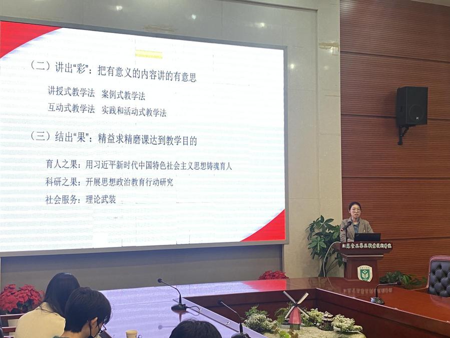 马克思主义学院盛良瑜老师汇报的主题为:“思想政治教师教学能力提升”。汇报总结了其在湖南师范大学培训期间的培训收获,聚焦于理论学习、实践教学、科研工作部分。盛老师着重分享了作为一名新老师如何将培训经验转化运用到思政课堂,如何将思政课堂讲清“理”、讲出“彩”、结出“果”。
