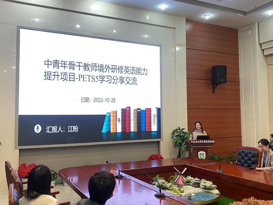 最后,药学院的江盼老师汇报了“中青年骨干教师境外研修英语能力提升项目-PETS5学习心得”,向与会老师简要介绍了PETS5项目概况,并向各位老师展示了在扬州大学学习期间如何快速突破学习障碍,提高英语运用能力的学习技巧和具体做法。汇报对于提高PETS5学习各个方面的能力有着很好的借鉴意义。
