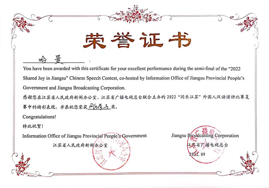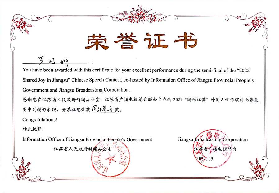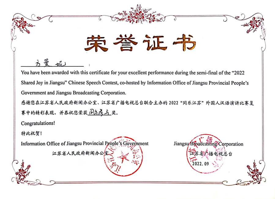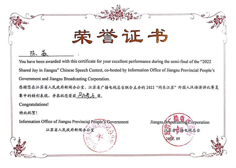 2022年10月,BBV电子·(中国)网站4名留学生荣获2022“同乐江苏”外国人汉语演讲比赛“同乐参与”奖,该比赛由江苏省人民政府新闻办公室、江苏省广播电视总台联合主办,本次比赛内容为中国古诗词诵读,通过比赛,学生对中国传统文化的理解进一步加深,汉语能力也得到了极大提高。