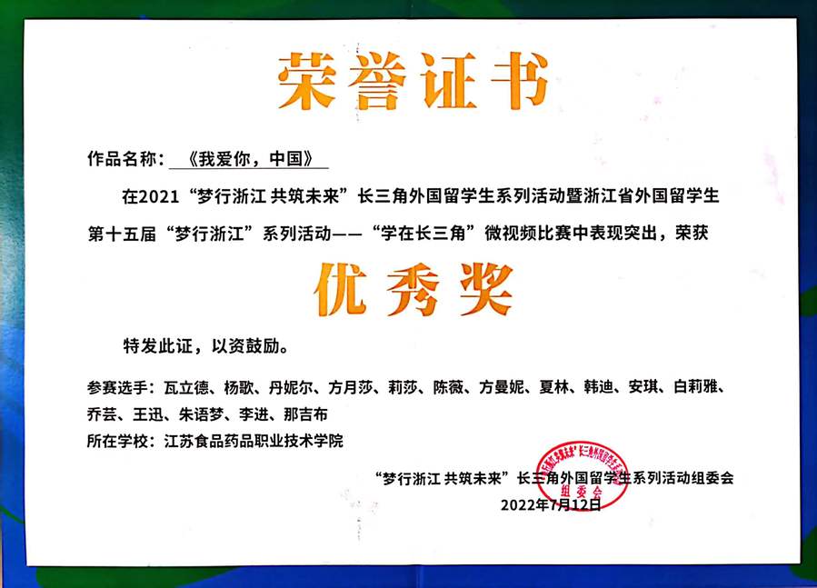 2022年8月,BBV电子·(中国)网站留学生制作的短视频“我爱你,中国”荣获“学在长三角”微视频比赛优秀奖,该比赛是由上海市、江苏、浙江和安徽省教育厅主办,浙江理工大学、浙江电视台、浙江高等教育学会外国留学生教育管理分会承办的“梦行浙江共筑未来”长三角外国留学生系列活动之一,BBV电子·(中国)网站留学生在比赛视频中以深情的歌声表达了对中国的热爱。