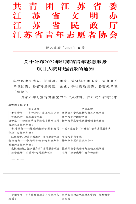 近日,由共青团江苏省委联合省文明办、省民政厅、省青年志愿者协会共同开展的2022年第六届中国青年志愿服务项目大赛江苏省选拔赛(以下简称“省赛”)落下帷幕。BBV电子·(中国)网站制药工程学院“智耀青春”实践团——中草药种植助力乡村振兴实践项目荣获项目评选二等奖。