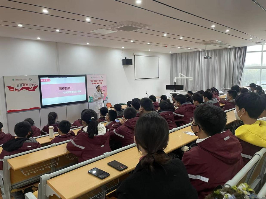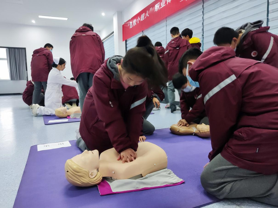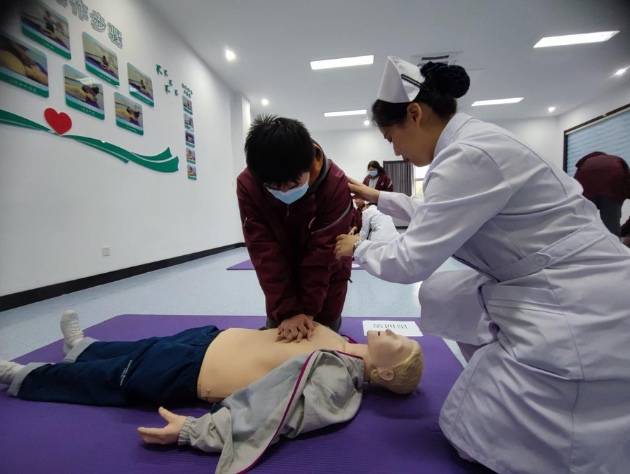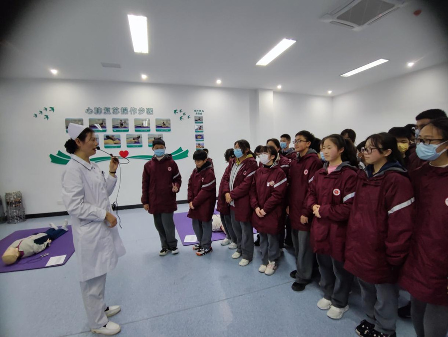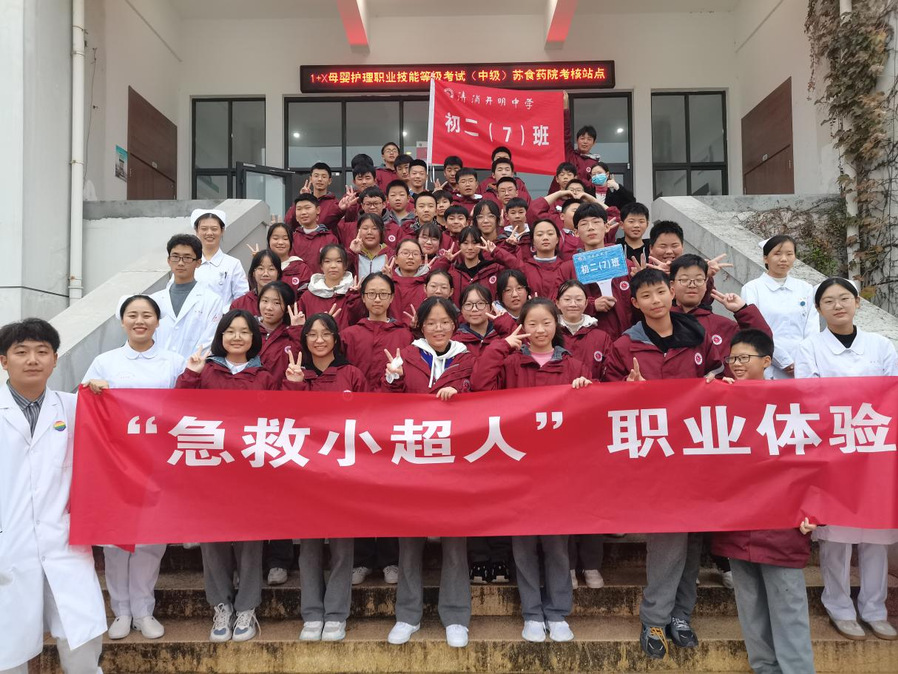 为进一步提高中学校园应急救护能力,切实保障青少年生命健康。11月19日下午,护理学院联合淮安市清浦开明中学,为该校初二7班的学生开展以“‘急救小超人’职业体验 我们是生命的守护神”为主题的应急救护知识技能体验。职业体验活动分为趣味讲解救护知识和救护技能体验两个环节,护理学院急救老师们和学生志愿者们指导初中学生围绕气道异物梗阻的海姆立克急救法、心源性猝死的心肺复苏术进行职业体验,初中学生积极参与,职业体验活动取得圆满成功。
