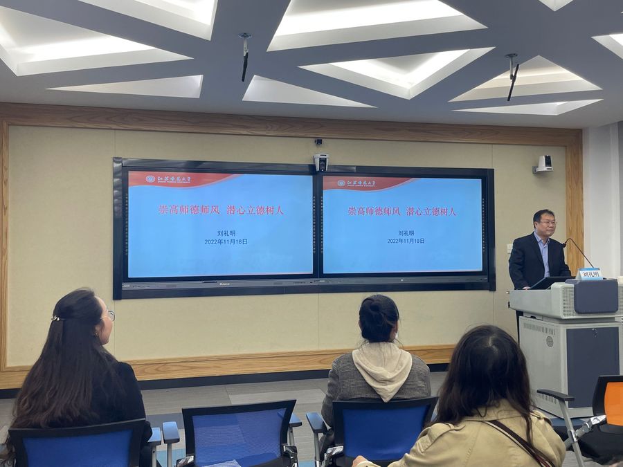 为进一步强化师德教育,弘扬高尚师德,力行师德规范,积极引导广大教师做 “四有”好老师,11月18日下午,党委教师工作部、教师发展中心联合举办了2022年第一期师德讲坛活动,江苏师范大学党委教师工作部部长刘礼明教授应邀作《崇高师德师风 潜心立德树人》专题讲座。本次讲坛由教师发展中心王贺玲主任主持。