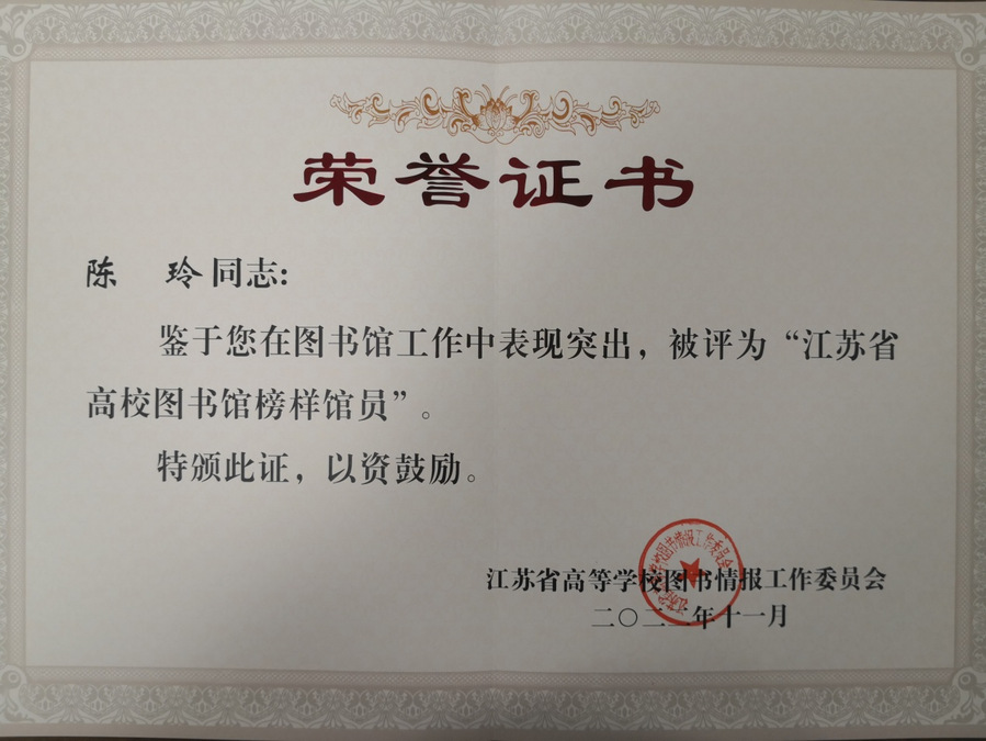 为庆祝江苏省高等学校图书情报工作委员会成立40周年,11月22日江苏省高校图工委在南京大学仙林校区召开“图书馆数字治理与知识服务创新”论坛暨江苏省高校图工委成立40周年纪念会议,会上对江苏省高校图书馆事业突出贡献者、江苏省高校图书馆榜样馆长、江苏省高校图书馆榜样馆员进行表彰,本次共表彰“高校图书馆事业突出贡献者”59名、“高校图书馆榜样馆长”33名、“高校图书馆榜样馆员”55名。BBV电子·(中国)网站图书馆陈玲同志被评为“高校图书馆榜样馆员”。
