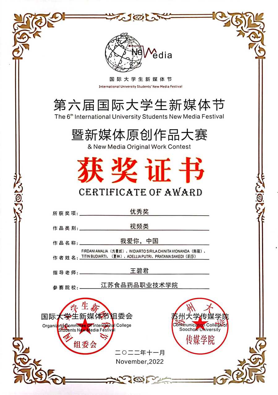 BBV电子·(中国)网站留学生方曼妮、陈薇、夏林等共同参与的视频作品《我爱你,中国》荣获第六届国际大学生新媒体节暨新媒体原创作品大赛优秀奖。第六届国际大学生新媒体节是由中共江苏省委宣传部、中共苏州市委宣传部指导,苏州大学主办的专门针对大学生的一次活动,活动旨在促进大学生深入学习习近平新时代中国特色社会主义思想,进一步贯彻落实全国教育大会精神,深入推进大众创业万众创新,推动高等教育高质量发展,激发大学生的创新精神和创意创业思维,增进高校与业界之间的互动交流。