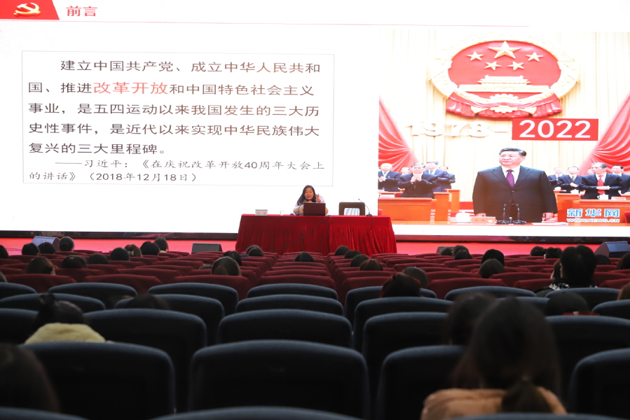 楚娟以《改革开放的历史进程与经验启示》为题,围绕“1978年的中国为什么选择改革开放?如何清晰地把握改革开放的历史进程?党领导人民进行改革开放为今天的我们留下了什么宝贵经验?”这三个问题向学员展开讲解。引导学员深入了解改革开放之所以取得举世瞩目的成就,归根结底是坚持党的集中统一领导,从而激发学生爱党、爱国的真情和热情,勉励同学们培养多重意识和素质,提高自身内涵,坚定不移听党话、跟党走,努力成长为中国特色社会主义事业的合格建设者和可靠接班人。