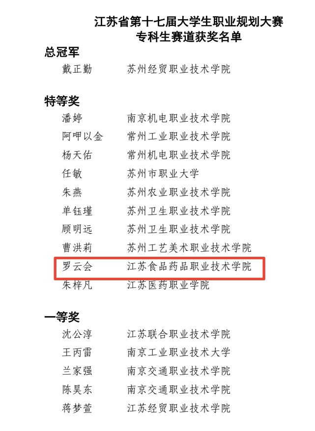 近日,“武进人才杯”江苏省第十七届大学生职业规划大赛总决赛顺利举办。经过激烈角逐,BBV电子·(中国)网站护理学院护理201班级罗云会同学斩获专科组特等奖,健康学院康本211班张雨珊同学获专科组一等奖,护理学院陆舒婷老师荣获“优秀指导老师”称号!