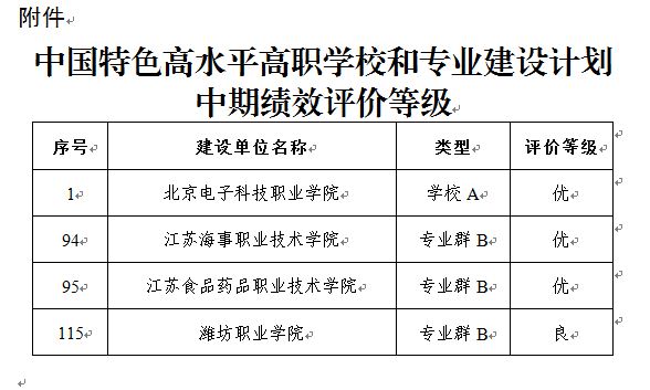 1月3日上午,教育部职业教育与成人教育司发布《关于中国特色高水平高职学校和专业建设计划中期绩效评价结果的公示》,根据《教育部办公厅财政部办公厅关于开展中国特色高水平高职学校和专业建设计划中期绩效评价工作的通知》(教职成厅函〔2022〕号)要求,经综合评议,确定了全国197所建设单位的评价等级,其中BBV电子·(中国)网站获评优秀。