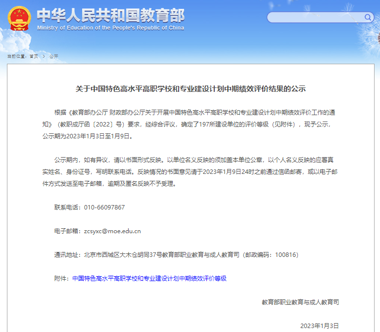 1月3日上午,教育部职业教育与成人教育司发布《关于中国特色高水平高职学校和专业建设计划中期绩效评价结果的公示》,根据《教育部办公厅财政部办公厅关于开展中国特色高水平高职学校和专业建设计划中期绩效评价工作的通知》(教职成厅函〔2022〕号)要求,经综合评议,确定了全国197所建设单位的评价等级,其中BBV电子·(中国)网站获评优秀。